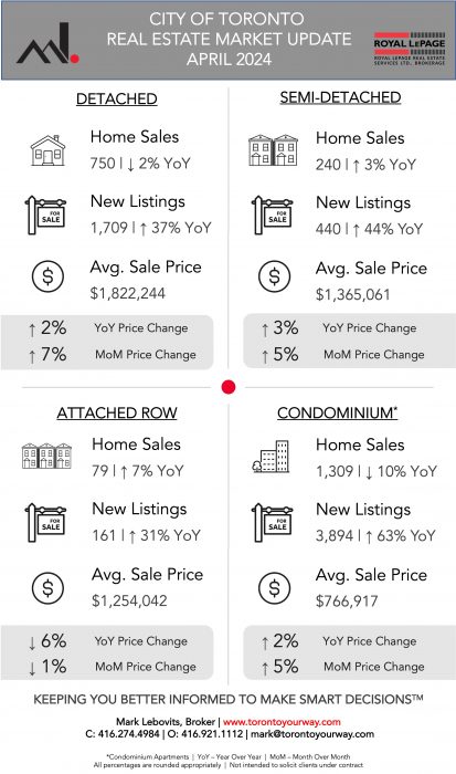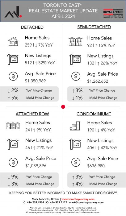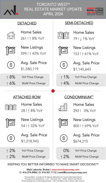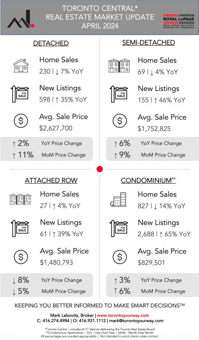 Last month, year-over-year overall housing prices increased by 3% in the City of Toronto. Below I have broken out the key statistics by Toronto’s districts (Central, West & East), as defined by TRREB, for a more in depth geographic look at how the numbers played out for April 2024.