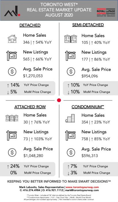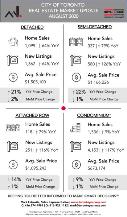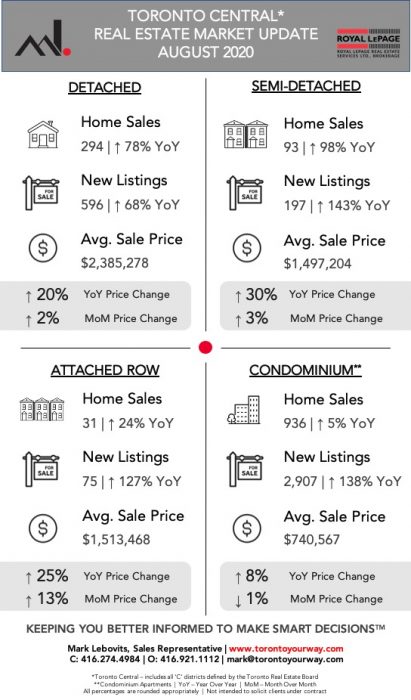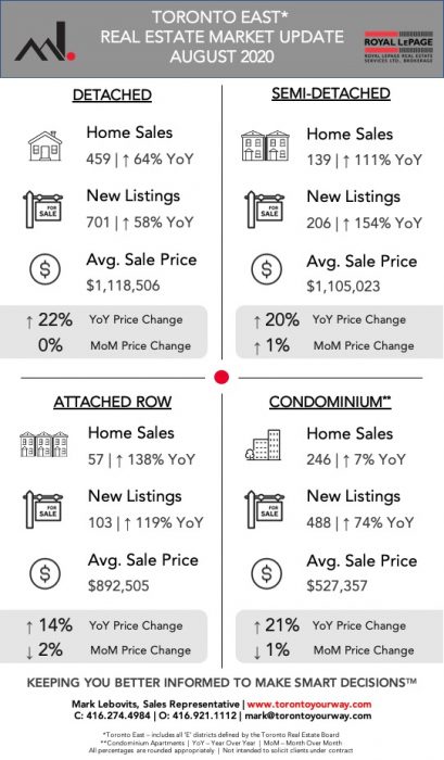 Last month, year-over-year overall housing prices were up 23.7% in the City of Toronto. Below I have broken out the keys statistics by Toronto’s districts (Central, West & East), as defined by TRREB, for a more in depth geographic look at how the numbers played out for August 2020.