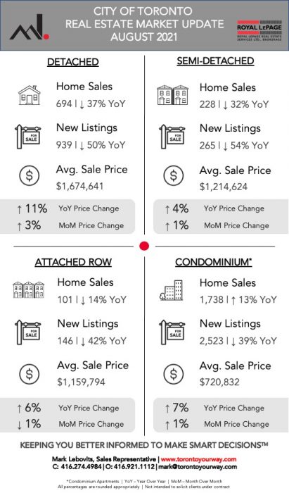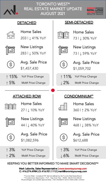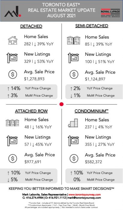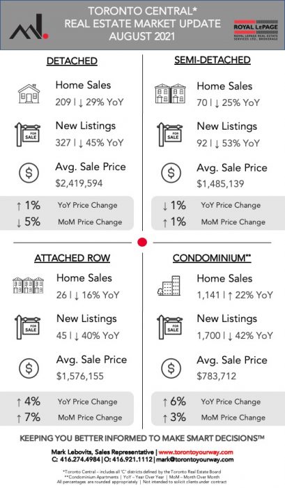 Last month, year-over-year overall housing prices were down 1.2% in the City of Toronto. Below I have broken out the keys statistics by Toronto’s districts (Central, West & East), as defined by TRREB, for a more in depth geographic look at how the numbers played out for August 2021.