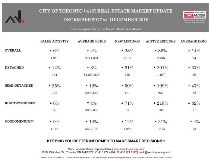 Although, inventory has continued to expand on a YoY basis, we are still seeing a normalization in pricing with an overall gain of 4% YoY. Home prices in the detached and attached row/townhouse segments displayed moderate price declines on a YoY basis (down 3% and 4% respectively). Semi-detached houses and condominium suites displayed strong double-digit YoY price growth in the month of December (12% and 14% respectively). The sales and price growth in these two categories is likely tied to an influx of first-time buyers entering the market before the January 1st mortgage qualification changes take effect. As we have now entered the new year, we will likely see a continuation of this trend towards condos, row/townhouse and semi-detached homes, as many buyers will qualify for less of a mortgage than they did in 2017. It will be interesting to see the effects of the new mortgage rules, as the data are made available over the next few months.