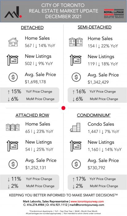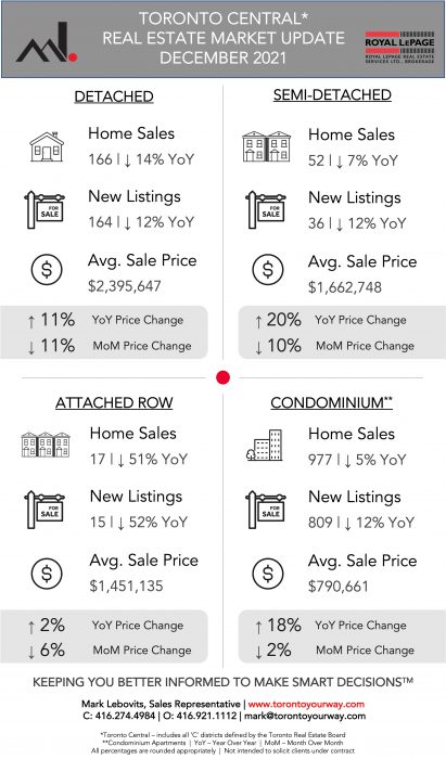 Last month, year-over-year overall housing prices were up 14% in the City of Toronto. Below I have broken out the keys statistics by Toronto’s districts (Central, West & East), as defined by TRREB, for a more in depth geographic look at how the numbers played out for December 2021.