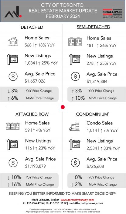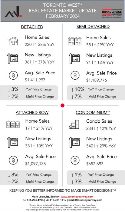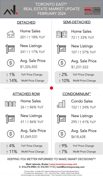 Last month, year-over-year overall housing prices remained flat in the City of Toronto. Below I have broken out the key statistics by Toronto’s districts (Central, West & East), as defined by TRREB, for a more in depth geographic look at how the numbers played out for February 2024.