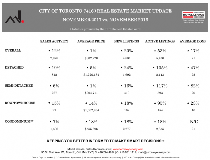 In the month of November, we continued to see a decline in sales activity year over year (YoY) for all home types in Toronto. In addition, we also began to see a YoY buildup of listing inventory, especially in the detached, semi-detached and row house segments. The growth in listing inventory was driven by new listings and longer sales cycles (# of days on the market). On a more positive note, we did see steady to slight declines in inventory levels when comparing November 2017 to October 2017 (month over month).